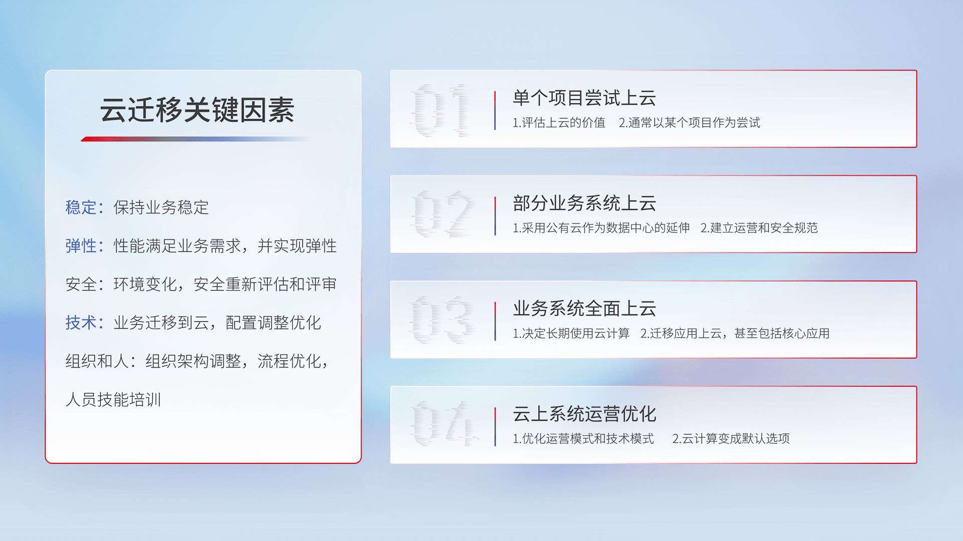 结合实际业务,,从规划设计、、、云平台选型、、、云原生改造、、、、数据迁移、、集成交付,,迁移全过程为客户识别最佳上云路径,,做好风险识别管理,,设计网络架构、、身份权限、、、、安全审计合规、、、操作审计、、、、日志审计、、、、监控告警策略、、、、多站点容灾设计等,,,,对云上基础设施进行整体规划,,,,提升IT治理水平,,,,以满足弹性、、、高可用、、高性能的需求。。